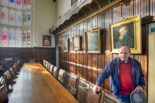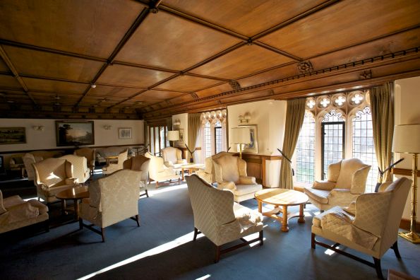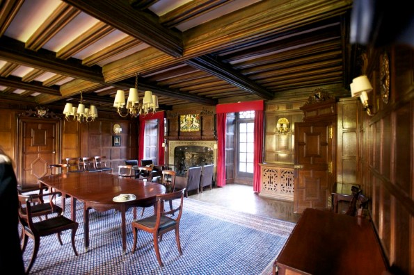 Then he pushes open a hidden door—built to blend into the wood paneling—leading into the adjoining Fellows Common Room. “We just call it ‘The Room,’” Barry says, ushering us inside. Dave and I gaze at the beamed ceilings, Tudor-era dark wood walls and stone fireplace and feel as if we’ve been admitted to the inner sanctum of the inner sanctum.