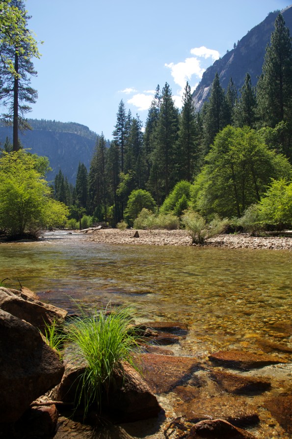 It’s hot, close to 90 degrees, and we don’t go far before dipping into the chilled waters of the Merced. Water so cold it hurts, until feet and legs go numb. The current nudges me downstream. I anchor myself by grasping the round granite boulders beneath the surface.