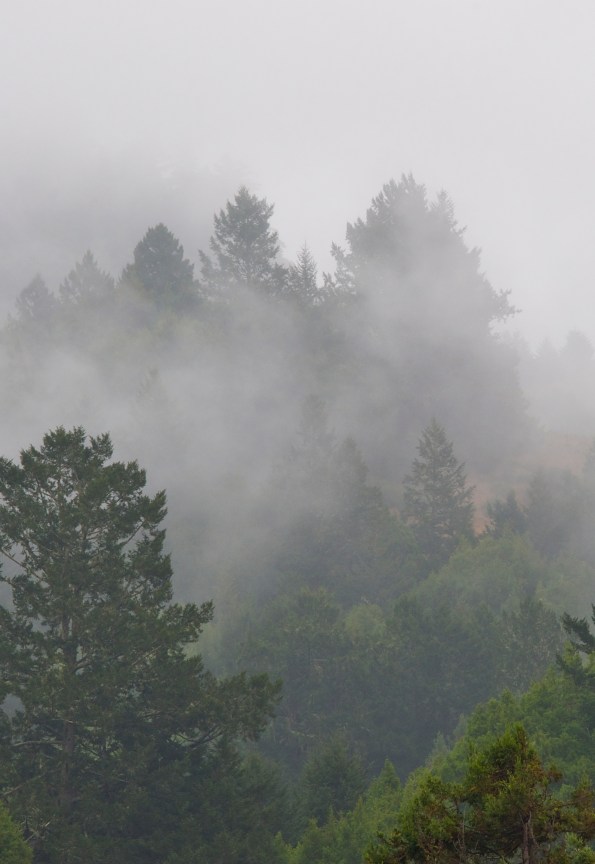 Heavy gray skies threaten more rain. Hairy black moss cloaks the pine trees, as if someone has draped the boughs in mourning crepe. Dead trunks sprawl across the trail.