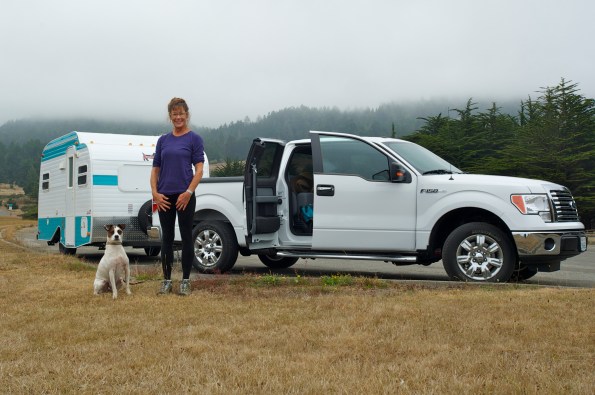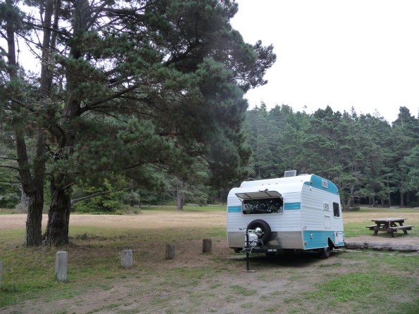 Trailer in tow, we pull up to the ranger’s hut without a reservation and are assigned a campsite with a million dollar view: the wide blue horizon of Monterey Bay. An auspicious beginning for our first trailer trip. In preparation for this day, we’ve spent hours darting back and forth between house and trailer; assembling, packing, testing and arranging our shelter on wheels, plagued (speaking for myself) with start-up angst over what will be necessary, what will be desired, and what will fit.