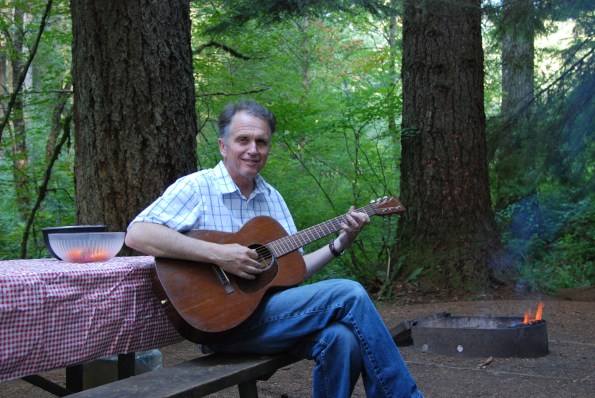 The evening is mild, and we eat dinner outside: turkey burgers spiced with shallots and herbs accompanied by sautéed asparagus, carrots and broccoli rabe. In the site next to ours, four cheerful young men sit around a blazing fire. Two of them are identical twins, celebrating their 30th birthday(s). They have brought a boom box, and are playing Eagles songs from the 70’s. “Is the music bothering you?” they ask. “No; no,” Dave assures them. “I like it.” (The Eagles are a favorite band since college.) After dinner, one of the twins, baseball cap worn backwards, walks over and hands us a paper plate with a generous slice of birthday cheesecake. “Sure the music’s not too loud?” he asks again. No worries. We remember what it’s like to turn thirty. Besides, the party mood is contagious.
