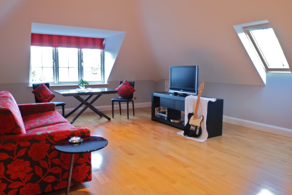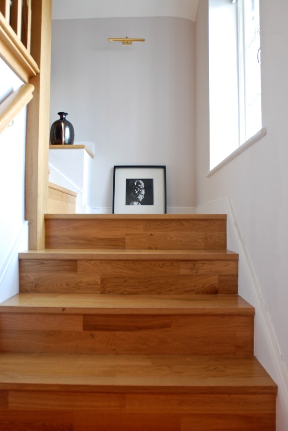 A fresh pine staircase leads to our one bedroom flat over Phil and Jenny’s garage.