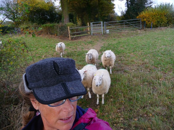 A country lane leads to a storybook view of pasture and woodland. Wooly sheep graze in the field. My route, a worn track in the grass, leads past these (harmless?) creatures.