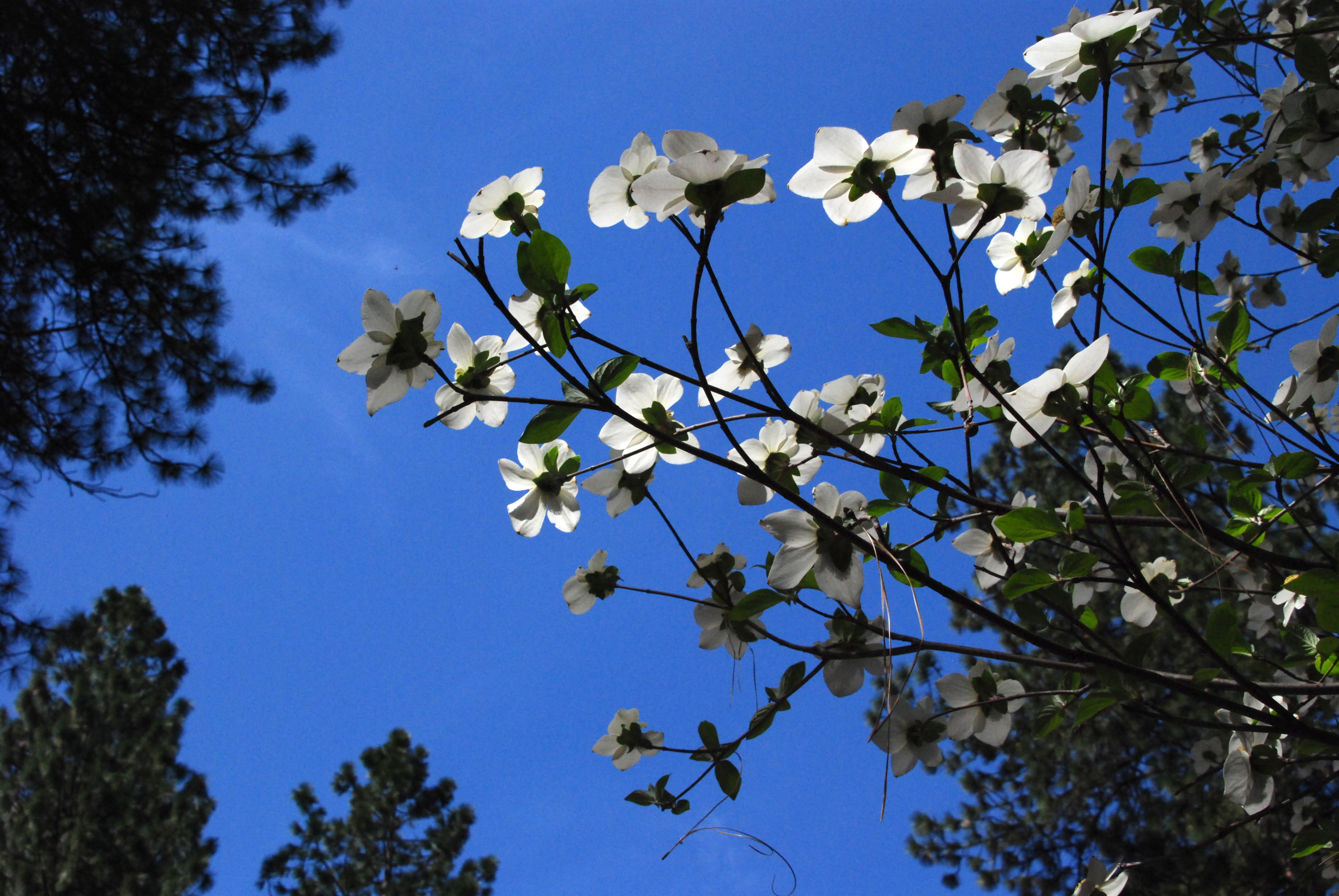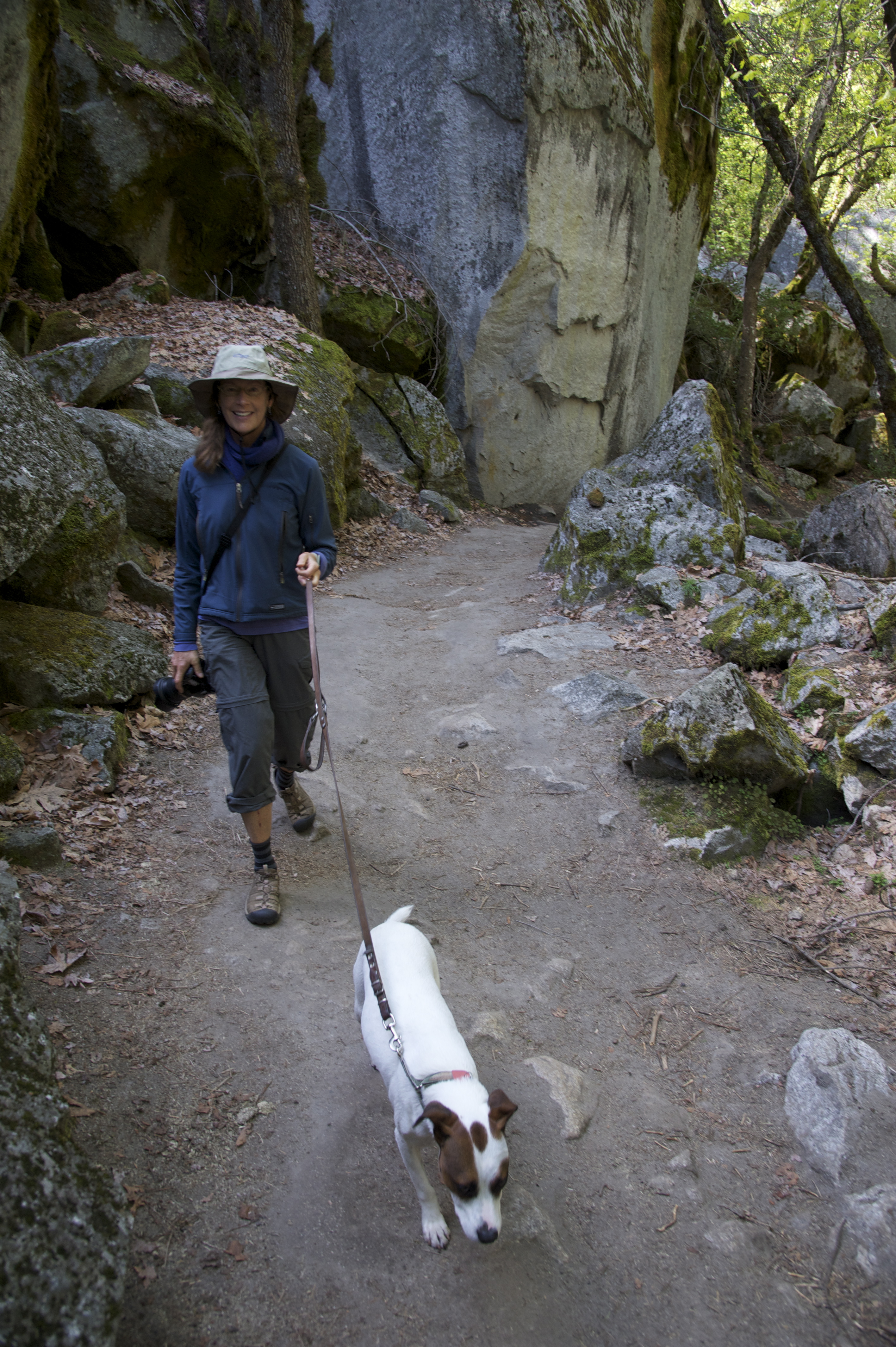 Basil tries to chase about fifty squirrels, but is thwarted by his leash. Water spills across our path under the Royal Arches, and the three of us leap from rock to rock. Near the Ahwahnee Hotel, we photograph a magnificent grove of dogwood trees in full flower. The only other soul we meet is a squawking Stellar Jay, and we feel as if we have the valley to ourselves.