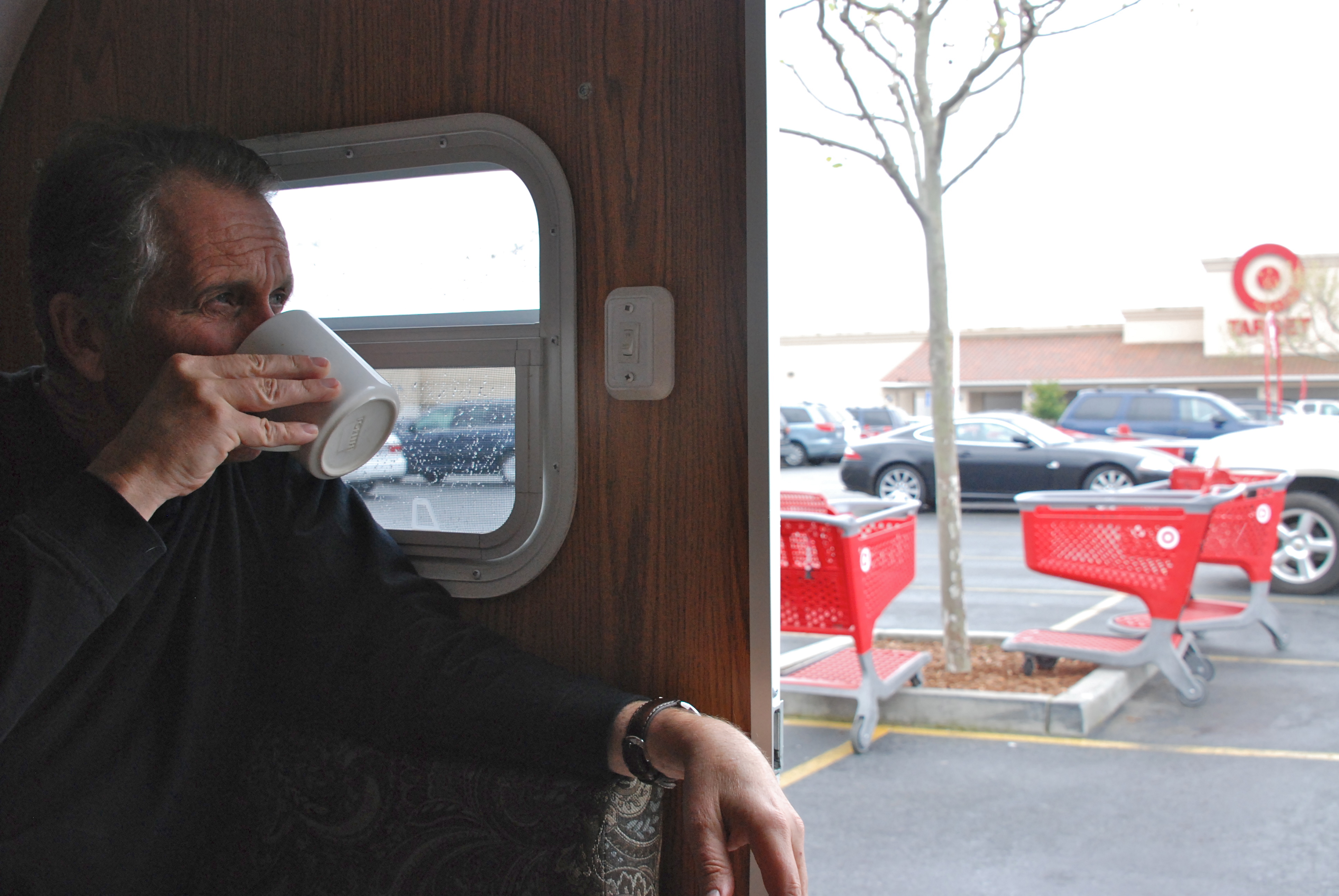 The good news is that we have spent the night at a campground a mere two miles from home. After breakfast, we return to the house for the things we’ve forgotten (raingear and winter clothes, for me) and then head for Target for a few last items on our list. Shopping takes longer than we’d planned, and when we’re done it’s lunchtime, so without further ado we repair to the trailer for sandwiches and cappuchino. Right there on the blacktop overlooking parked cars and bright red shopping carts. Convenient, inexpensive and delicious. I’m liking our snug little trailer more every minute.