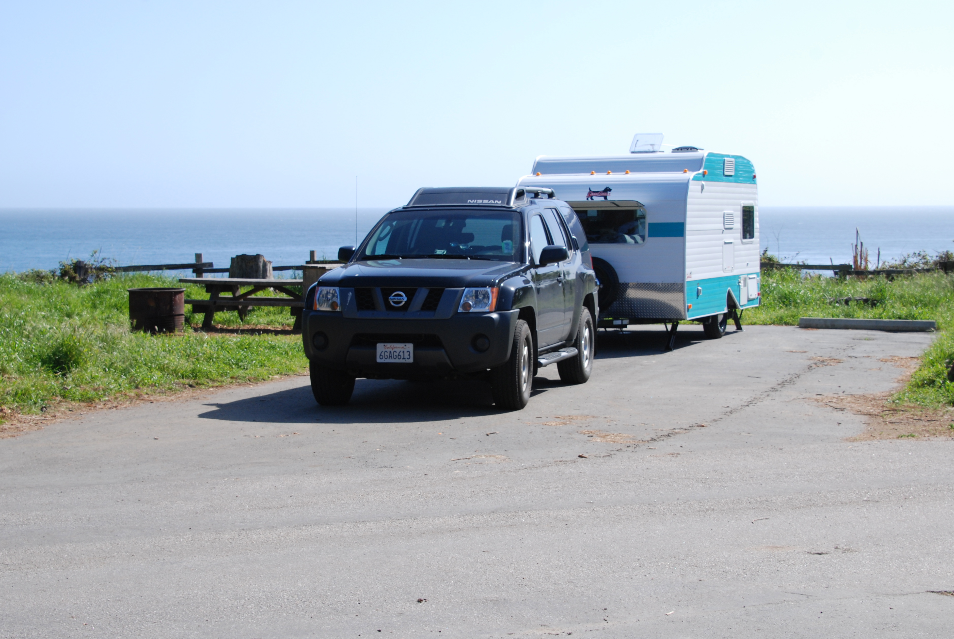 Trailer in tow, we pull up to the ranger’s hut without a reservation and are assigned a campsite with a million dollar view: the wide blue horizon of Monterey Bay. An auspicious beginning for our first trailer trip. In preparation for this day, we’ve spent hours darting back and forth between house and trailer; assembling, packing, testing and arranging our shelter on wheels, plagued (speaking for myself) with start-up angst over what will be necessary, what will be desired, and what will fit.