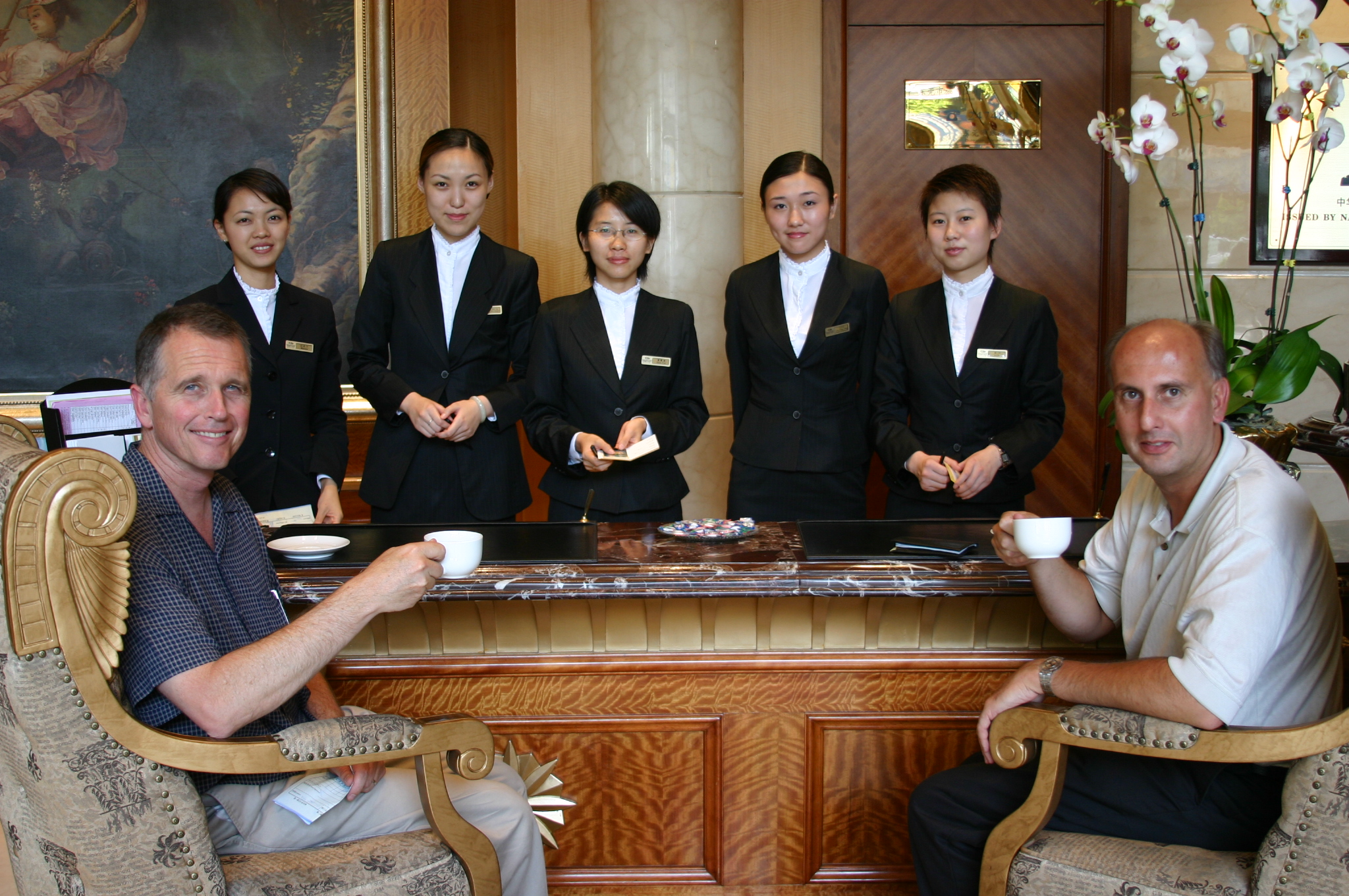 Checking into our hotel requires many smiling assistants and several cups of tea.