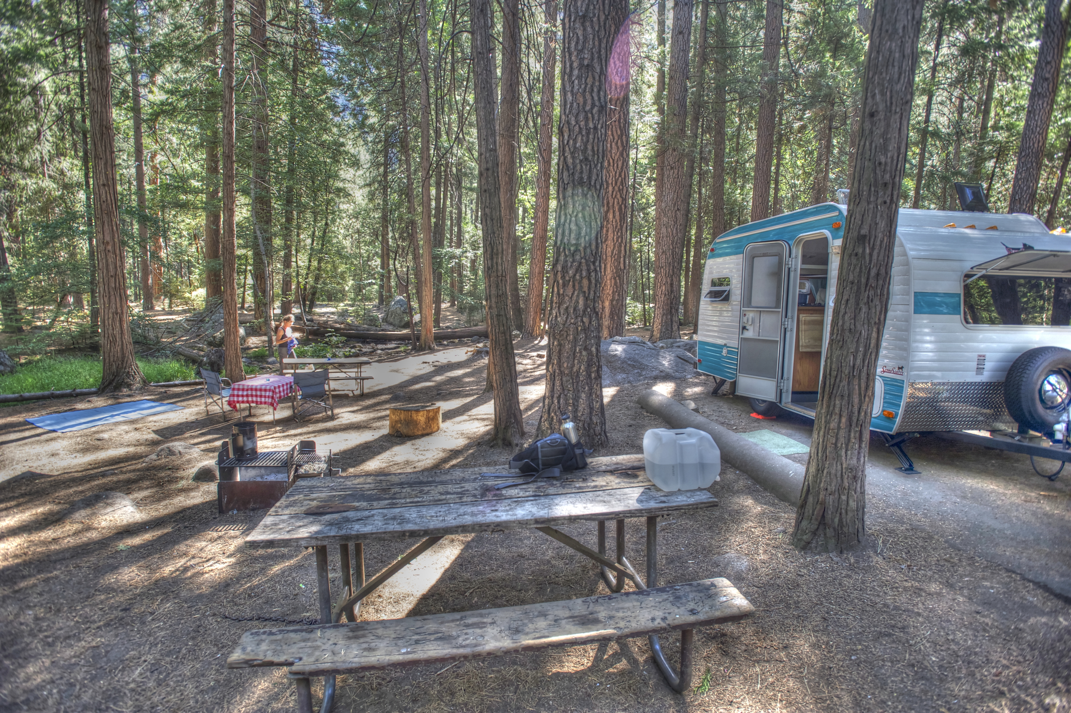 The seasonal creek at the edge of the forest still flows past our Upper Pines campsite, even now, in the first week of September. Wood smoke permeates the campground. We’ve arrived at the dinner hour, so after leveling the trailer and establishing camp, we attend to our evening meal: grilled steak, roasted potatoes and marinated string bean salad.