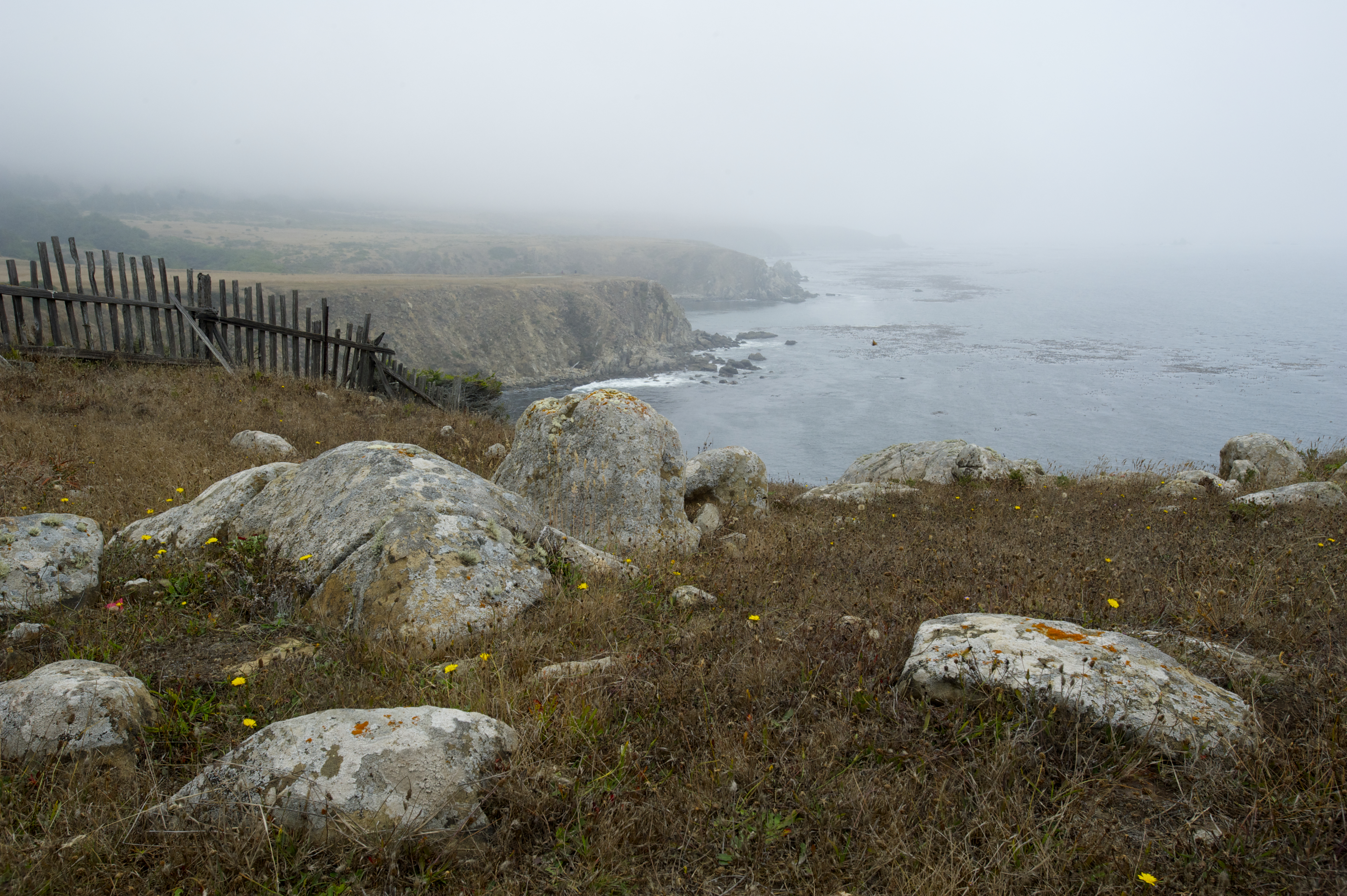 We climb for an hour on a sun-baked trail. Early on, we shed coats and stash them behind a rock, and Dave rolls up his jeans as if digging for clams. We continue past Manzanita bushes, flowering Indian Paintbrush and boulders daubed with rust and mustard-colored lichen. In a few places, oily poison oak leaves stray across the trail. I keep watch for snakes, and sight a tail-tip sliding off the path into tall grass. At the overlook, Dave composes a few pictures, but overall finds the lighting and scenery less than inspiring.