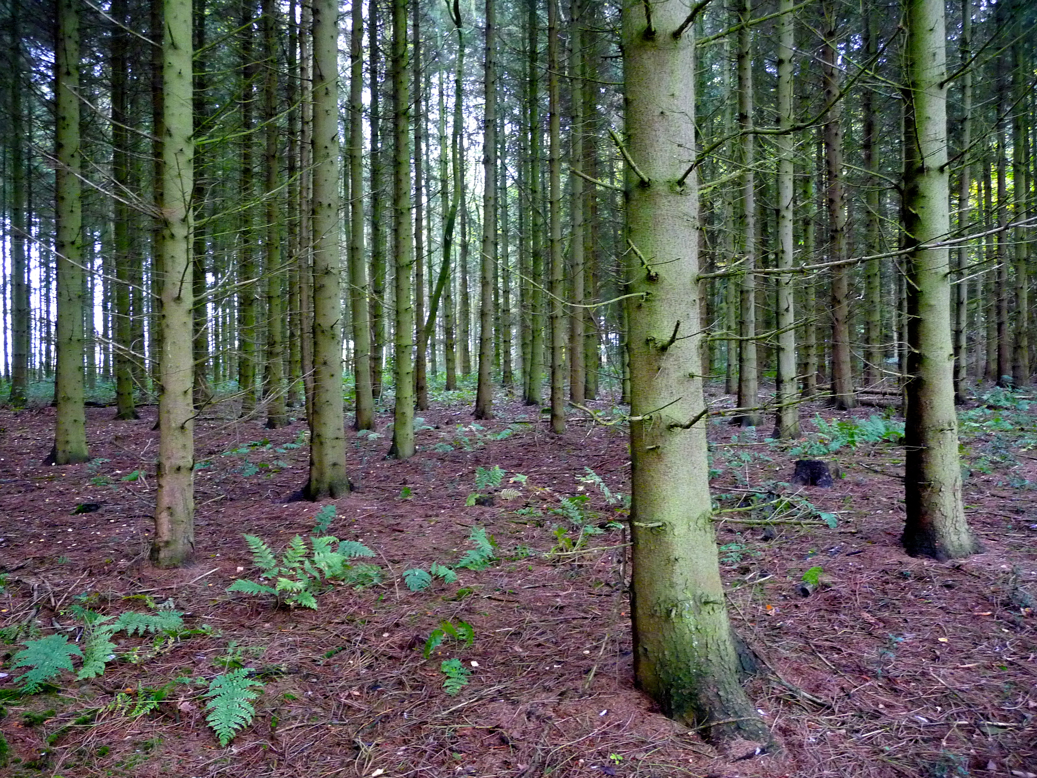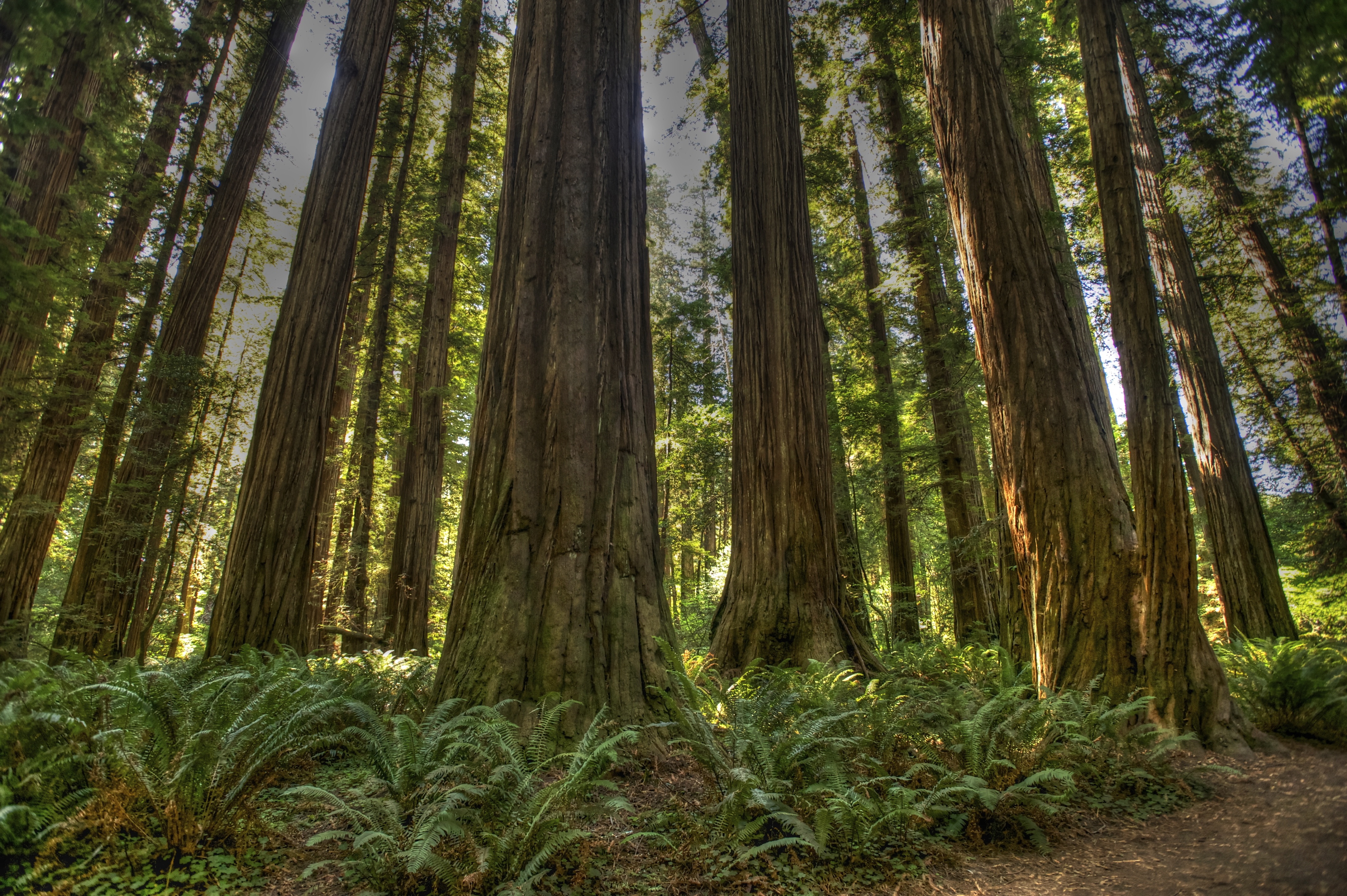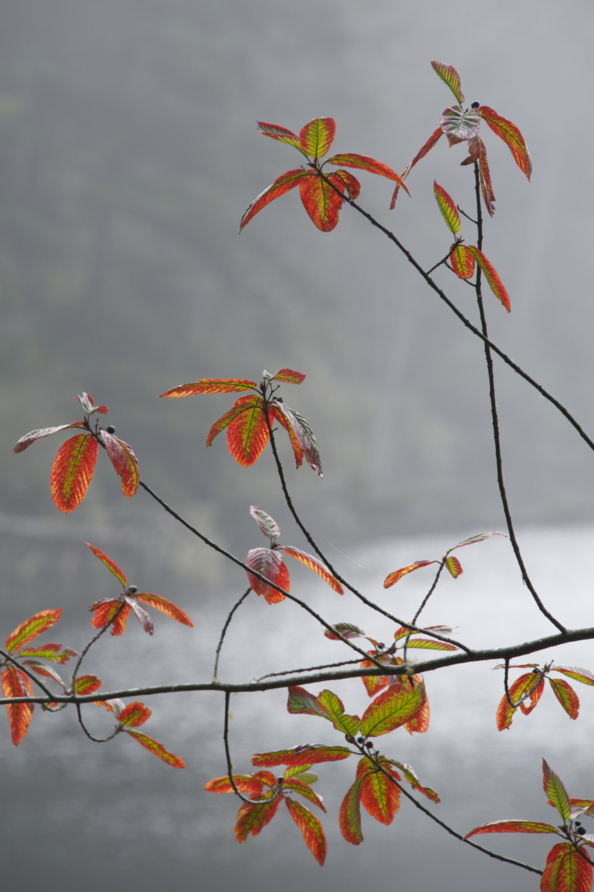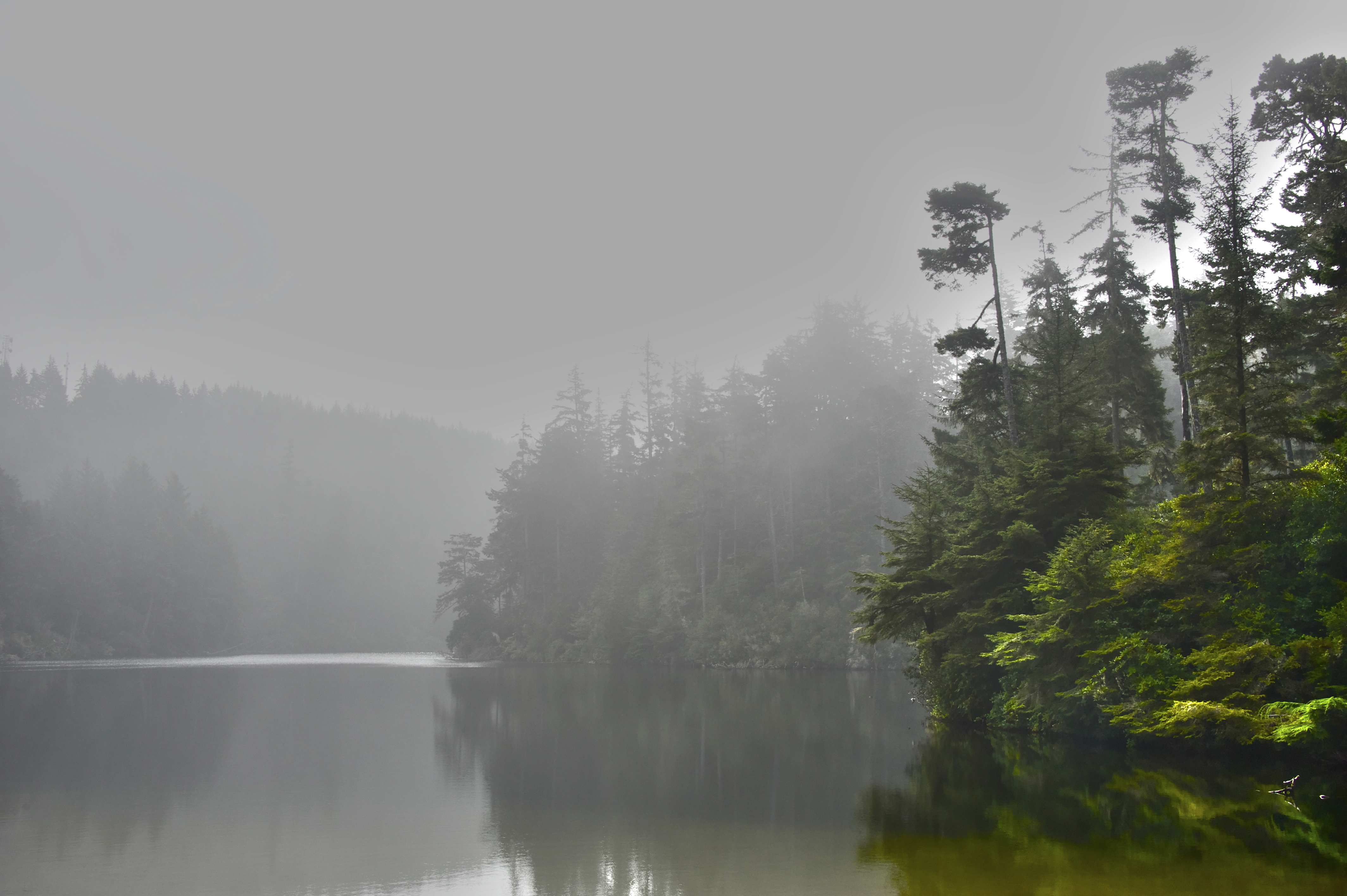 Heavy gray skies threaten more rain. Hairy black moss cloaks the pine trees, as if someone has draped the boughs in mourning crepe. Dead trunks sprawl across the trail.