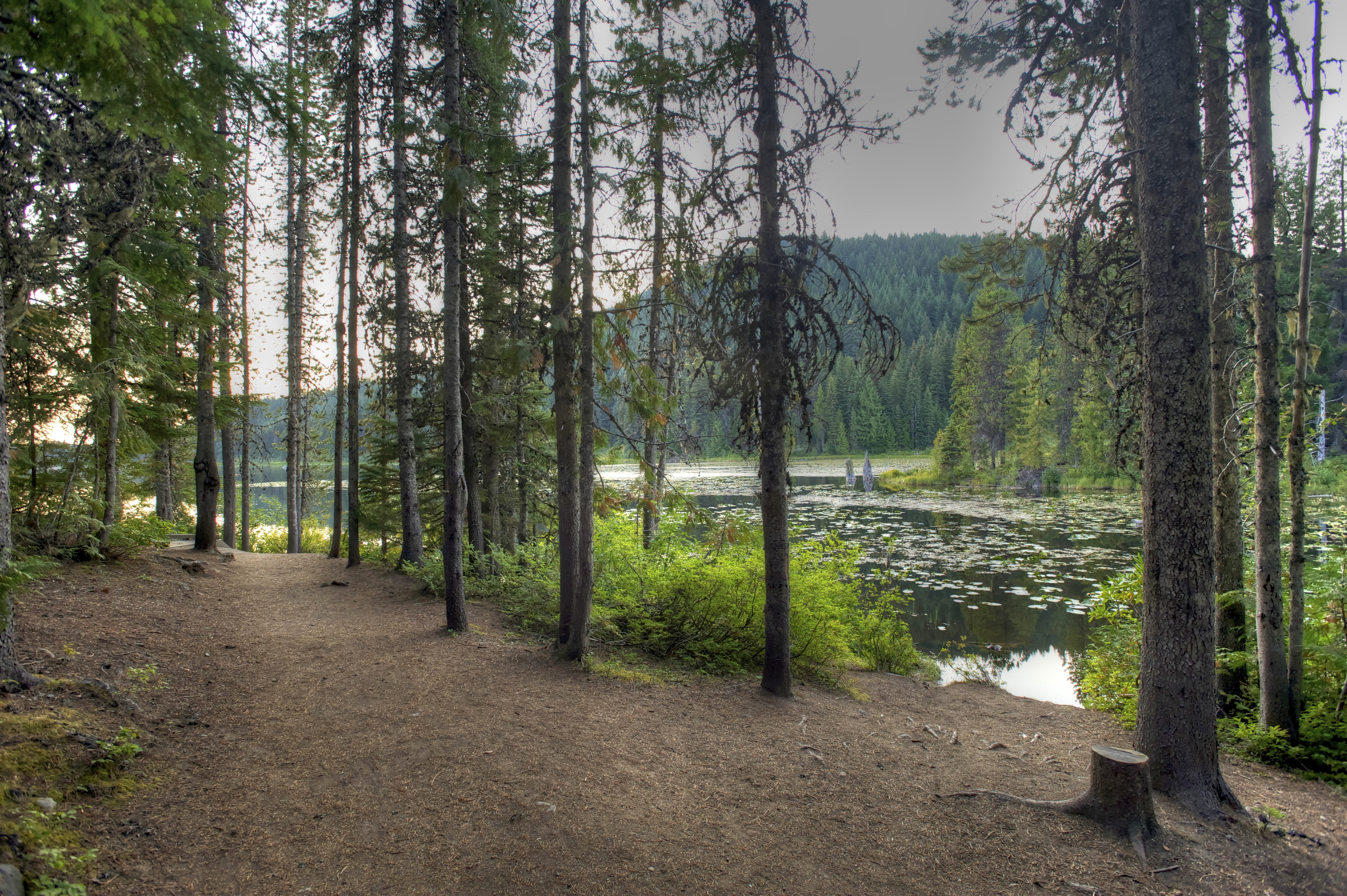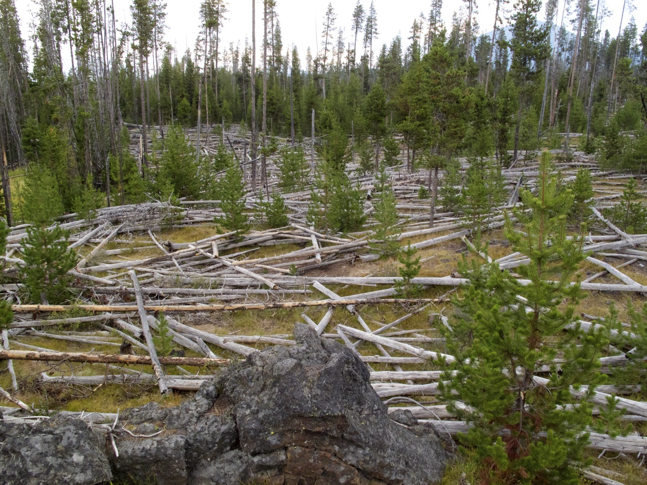Past Mount Bachelor, the scenery changes into a monotonous tract of pine trees bereft of undergrowth. Almost spooky. No flowers, no bushes, only spindly Lodgepole pines stretching away in all directions. Dark thunderclouds mass overhead.
