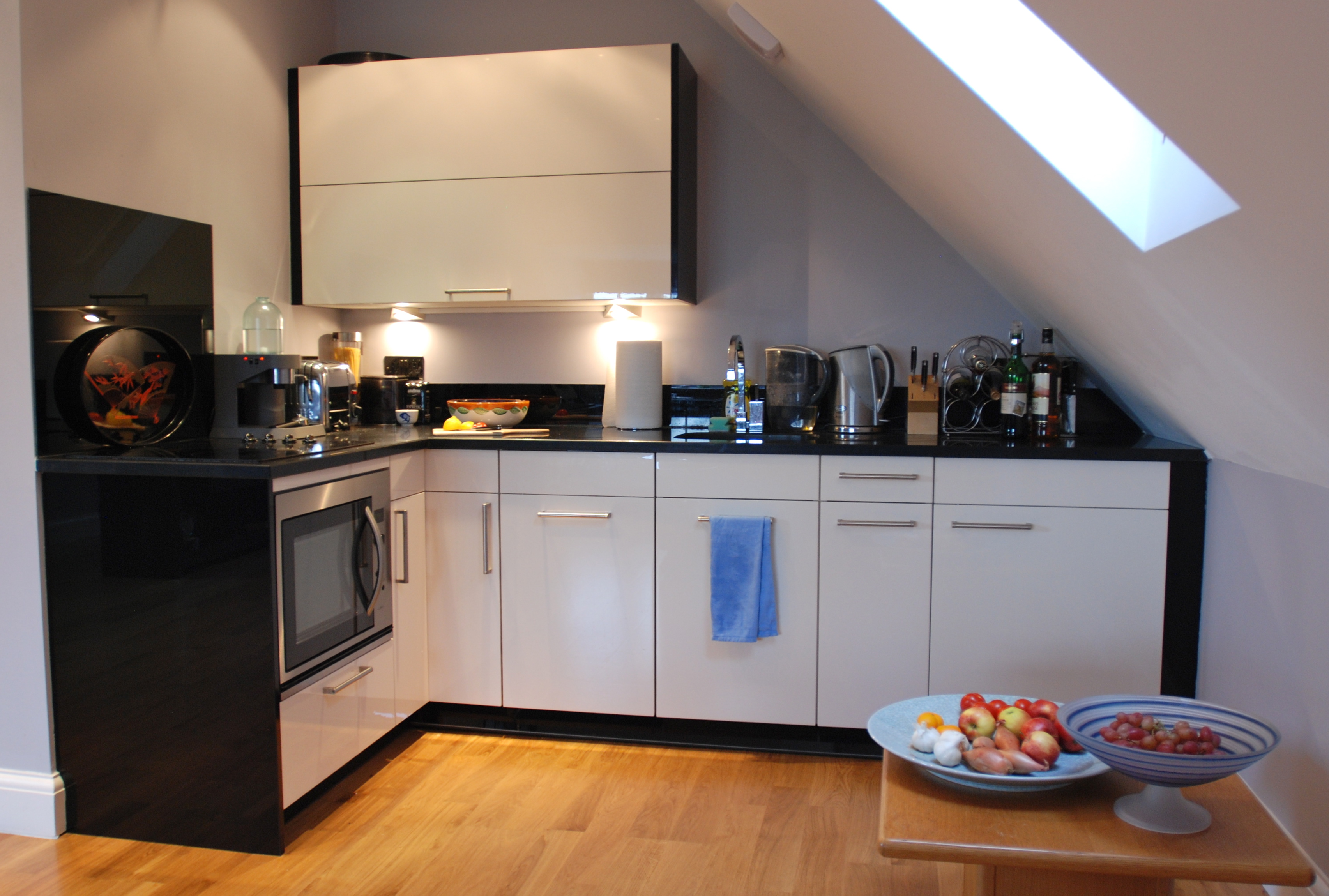 A fresh pine staircase leads to our one bedroom flat over Phil and Jenny’s garage.