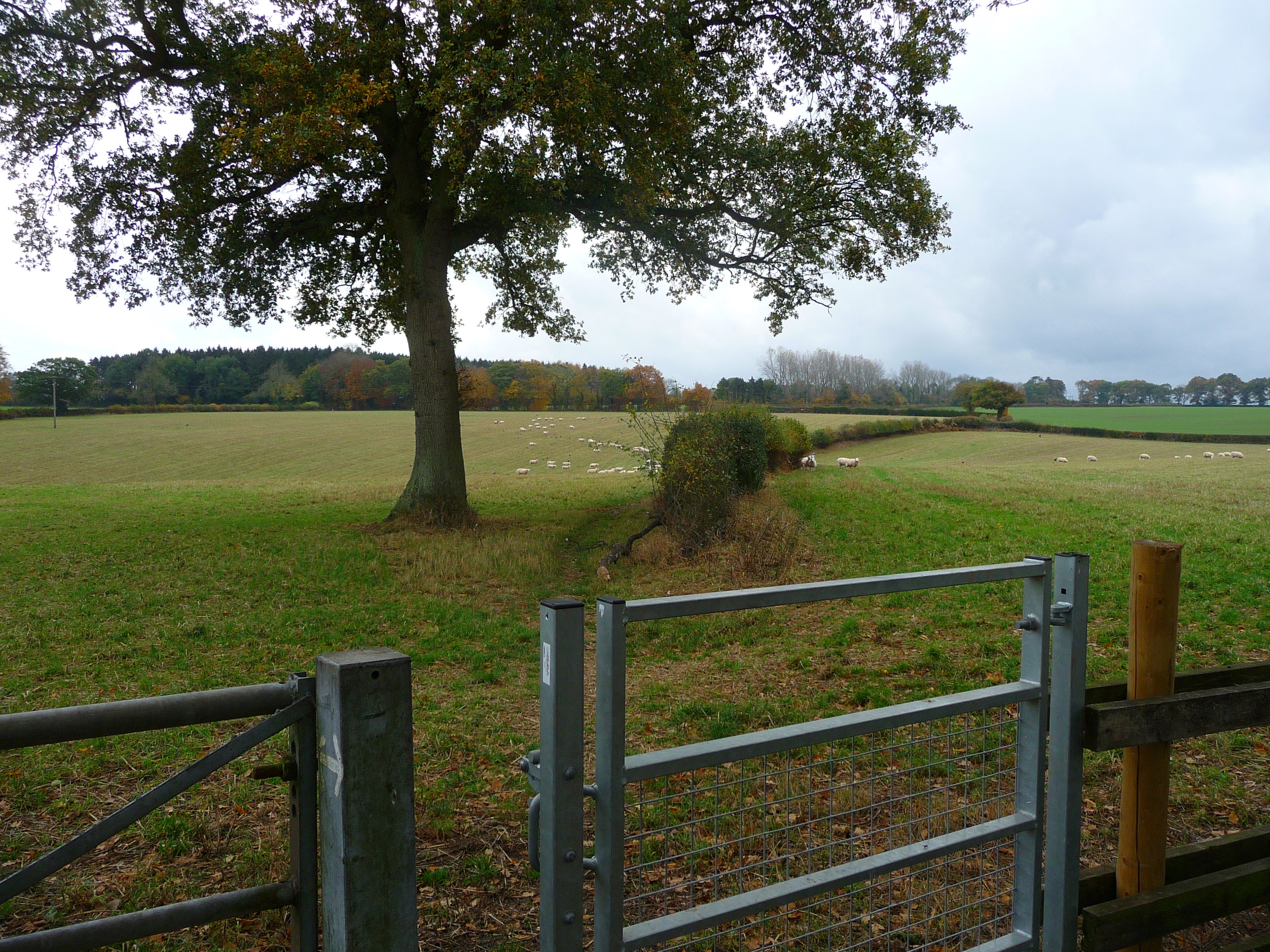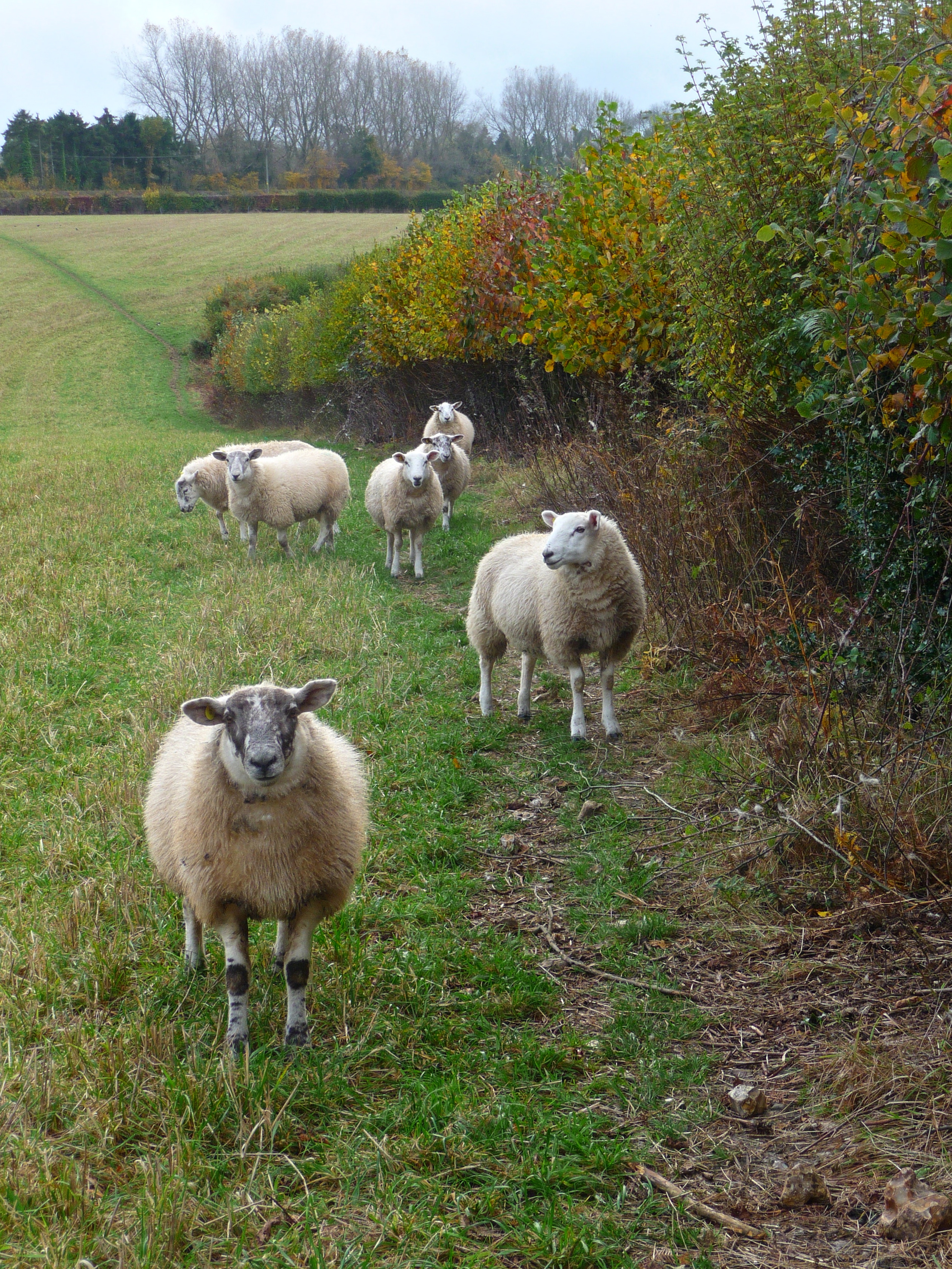 A country lane leads to a storybook view of pasture and woodland. Wooly sheep graze in the field. My route, a worn track in the grass, leads past these (harmless?) creatures.